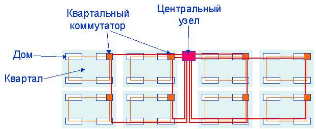 Примеры сетевых решенийНа рисунках ниже приведены схемы организации домовой сети Ethernet с точки зрения возможной географической привязки узлов и с точки зрения ее иерархической архитектуры, описанной выше.   Рис.1 Возможная схема географической привязки узлов сети.