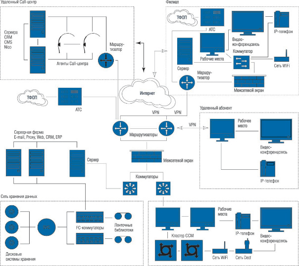 В случае, когда компания изначально работает с большими потоками информации, требующими сохранности. Когда безвозвратная утеря информации критична, перед компанией встает задача по формированию сети хранения данных. С учетом задач и функций компании возможно подобрать систему хранения того уровня и типа, которые бы максимально отвечали задачам. Высокопроизводительность и отказоустойчивость сетевой инфраструктуры достигается путем установки кластерной системы, например решения Cisco Call Manager. Такого рода решения необходимы для компаний с непрерывным типом ведения бизнеса.